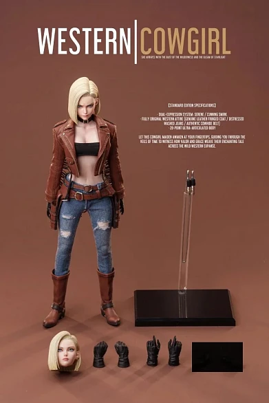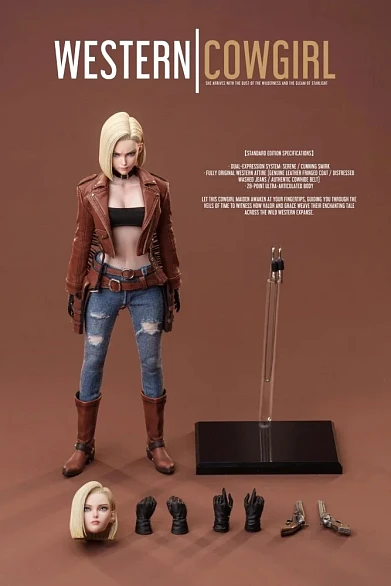 Комплектация: экшн-фигурка + 2 головы (спокойная + с ухмылкой) + куртка с бахромой из натуральной кожи + джинсы + ремень из натуральной кожи + ремень для оружия из натуральной кожи + 2 кобуры из натуральной кожи + ботинки + 3 пары рук + 2 револьвера + база