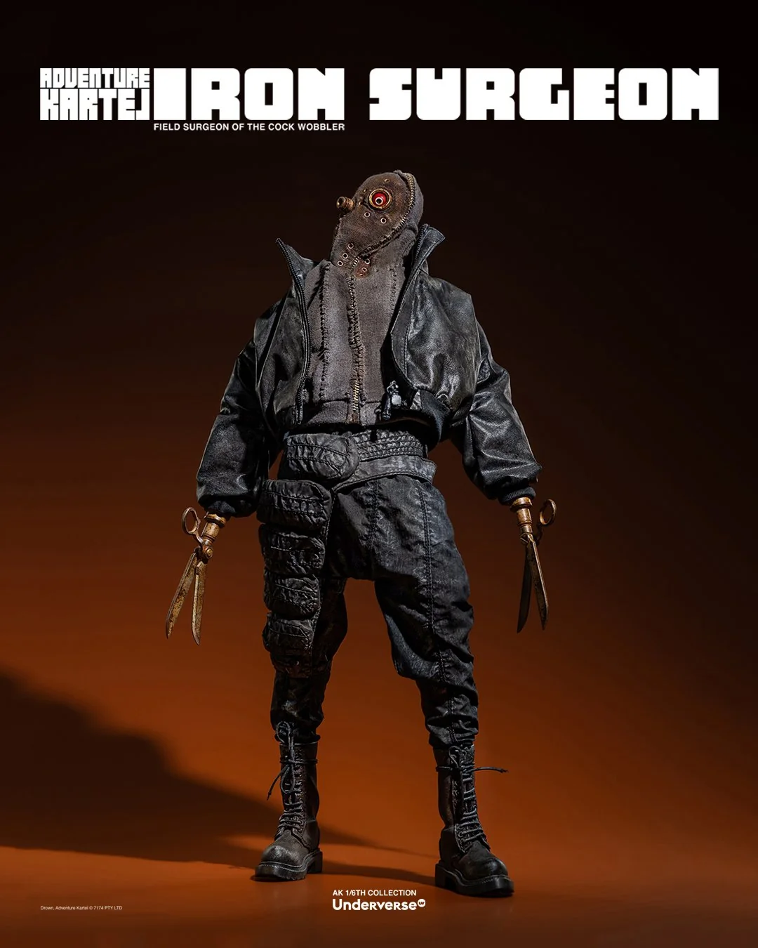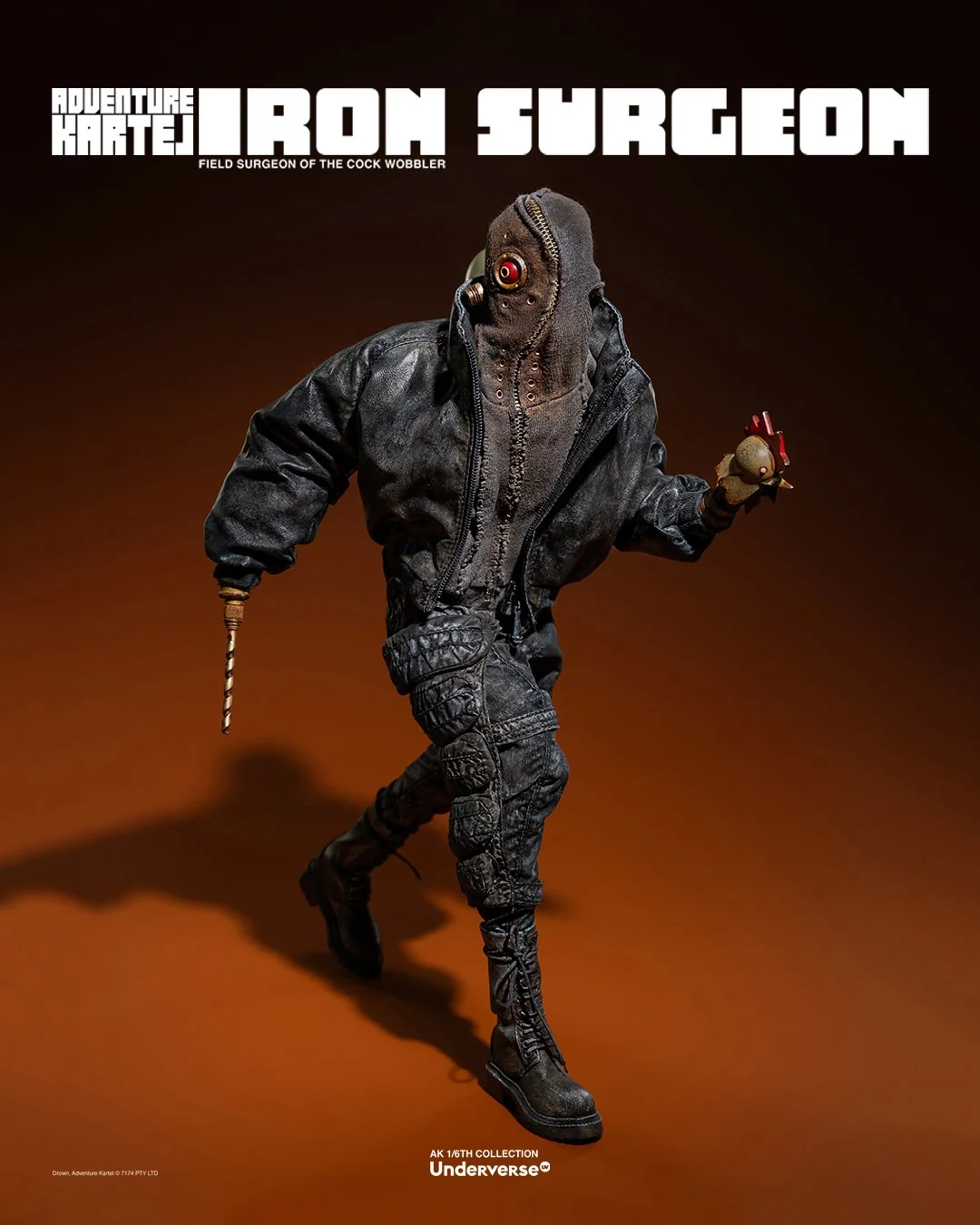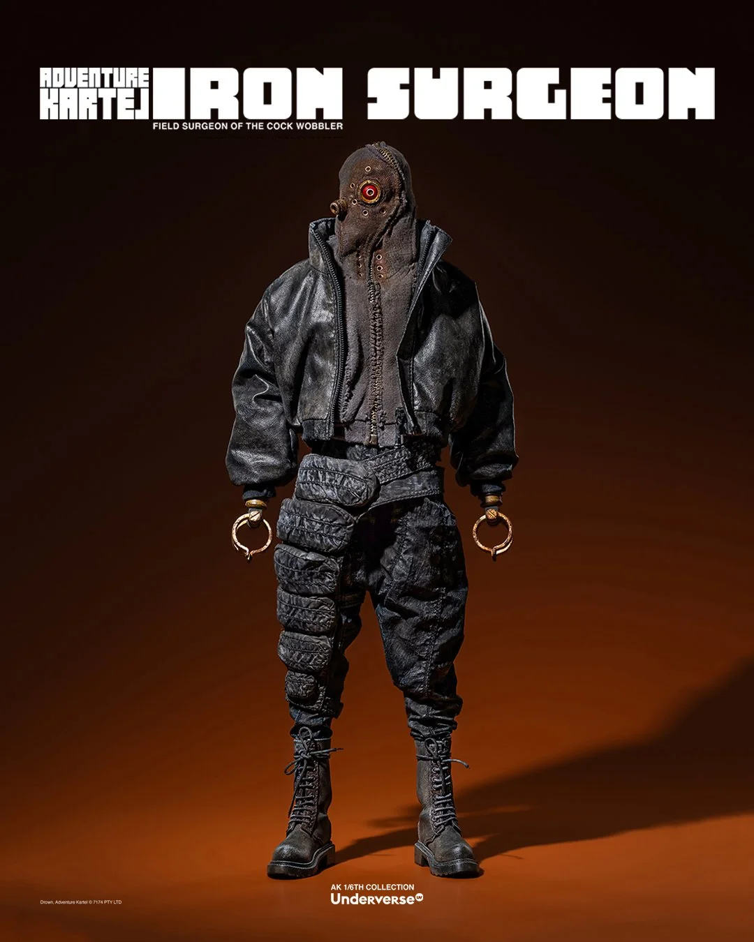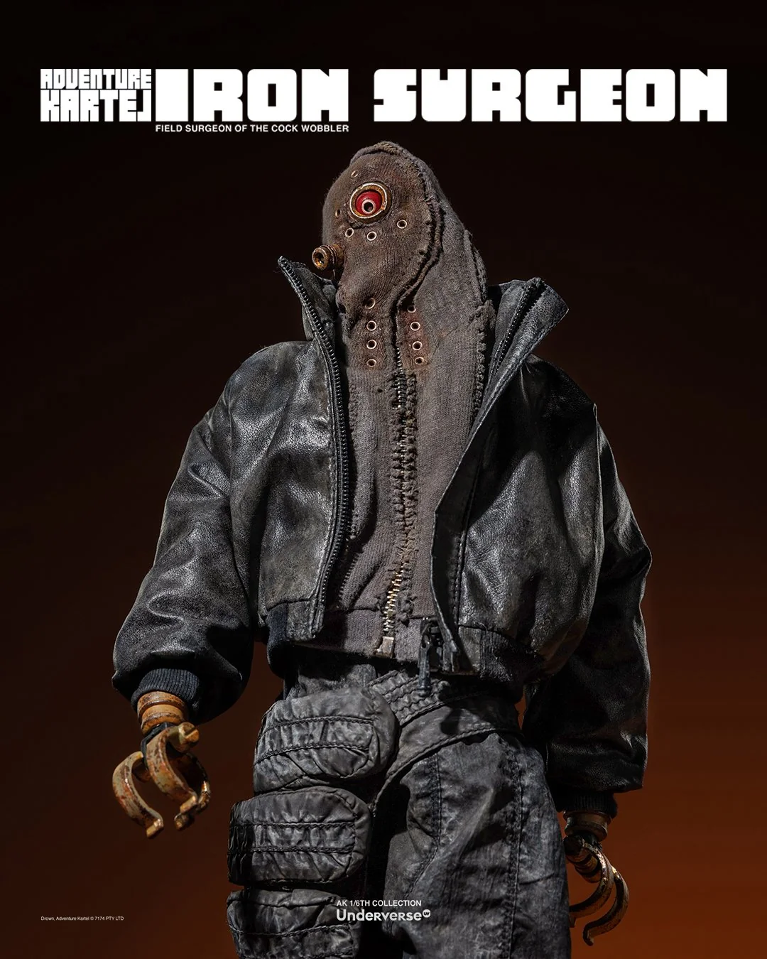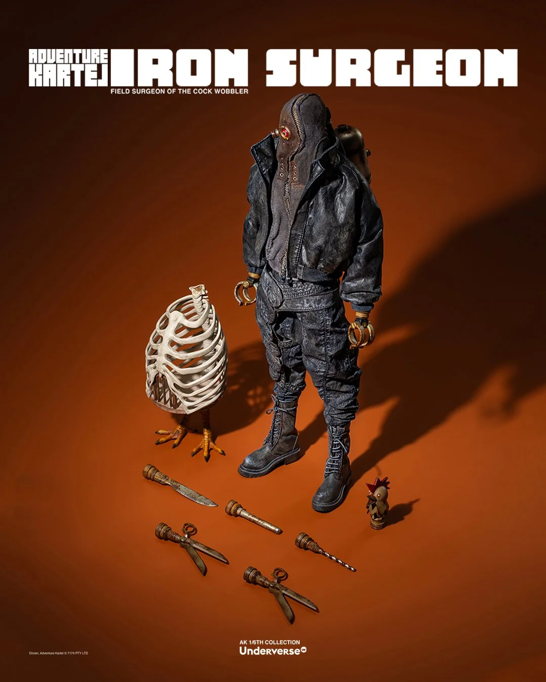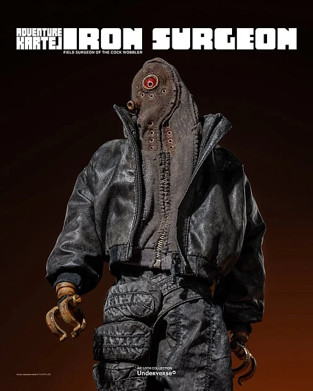 Комплектация: Фигурка The Iron Surgeon + Магнитная голова с двигающимися глазами + Маска + Кислородный баллон + Кожаное пальто + Кожаные штаны + Тканевая рубашка + Брючный ремень + Кожаные ботинки (пара)  + Набор сменных рук (8 штук)  + Подставка