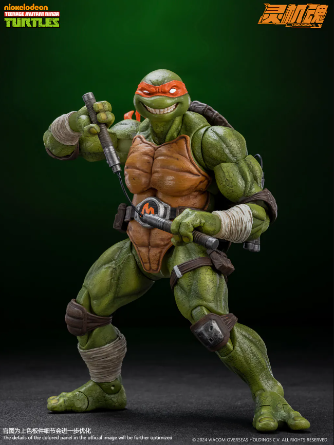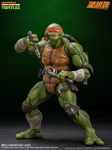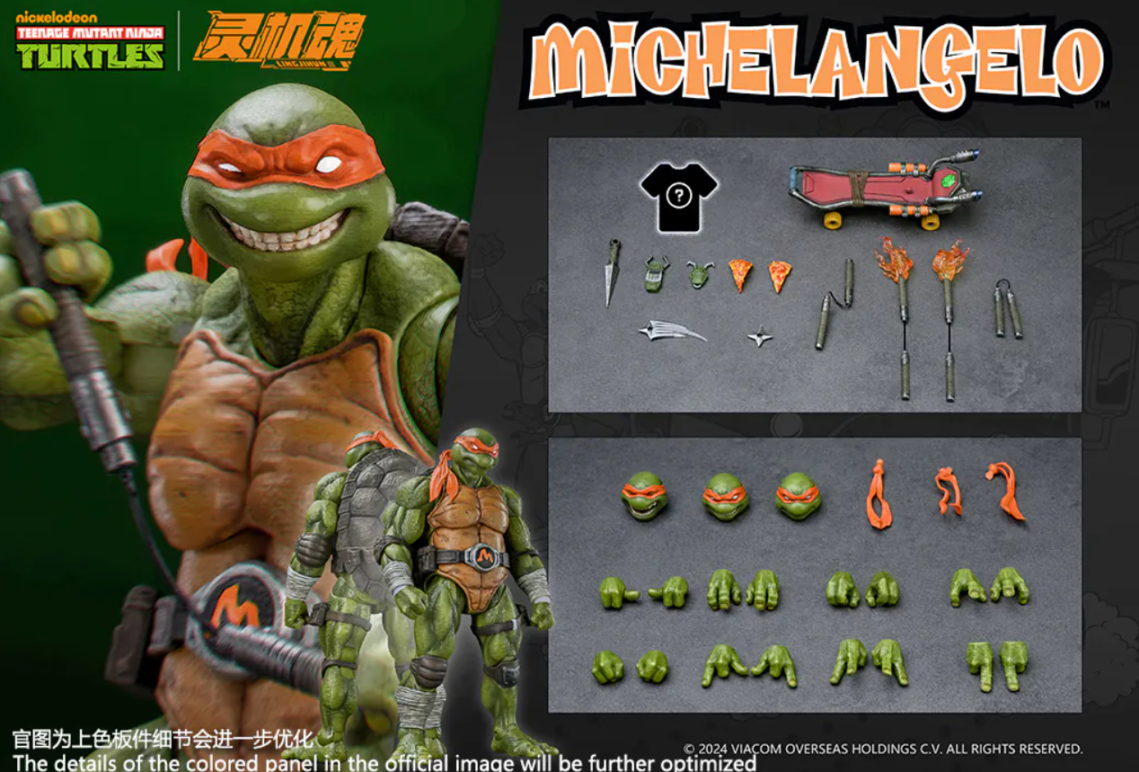 Комплектация: фигурка + 3 головы + 8 пар рук + 3 варианта хвостов повязки + кунай + сюрикен + сюрикен со спецэффектами + 2 пиццы + телефон + крюк + 2 пары нунчак + скейт