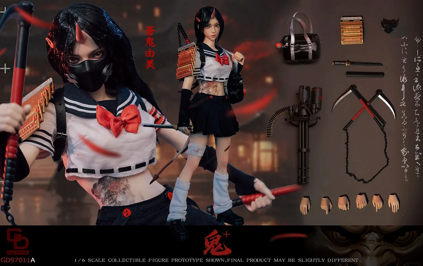 Комплектация: голова + тело + юбка + носки + футболка + обувь + пара рукавов + нижнее белье + маска для лица +бинт на ногу + карточка персонажа + наплечная броня + сумка + серпы + кинжал + миниган + 3 пары сменных рук