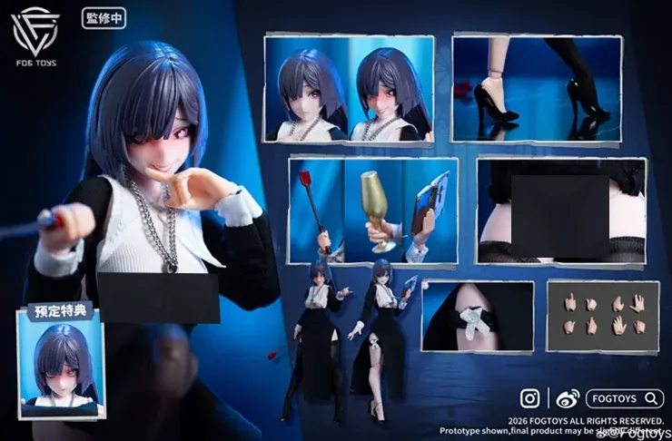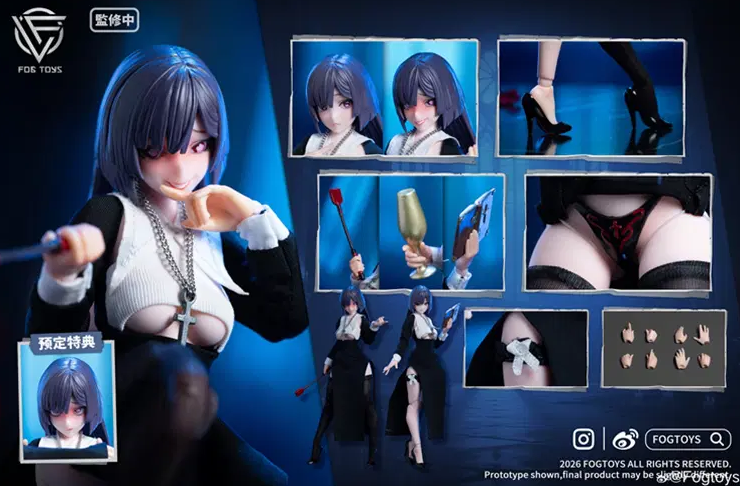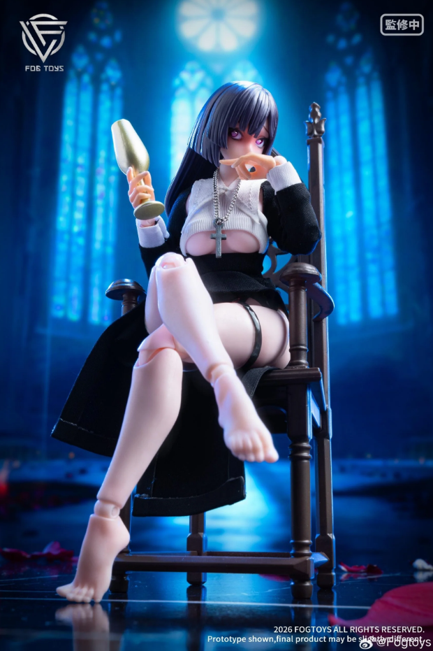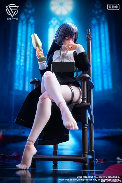 Комплектация: силиконовое тело + две сменные лицевые панели (подвижные глаза) + монашеское одеяние + пара белых чулок и ремень на бедро + четыре пары сменных рук + кнут + бокал для вина + серый крест на цепочке + библия + пара туфель на высоком каблуке