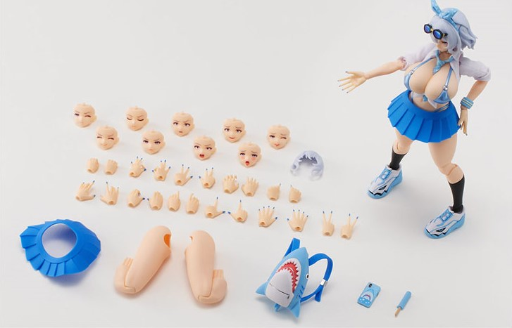 Комплектация: тело персонажа + 9 сменных лиц + 11 пар сменных кистей + сменная челка + сменные ноги + юбка + рюкзак-акула + телефон + мороженое