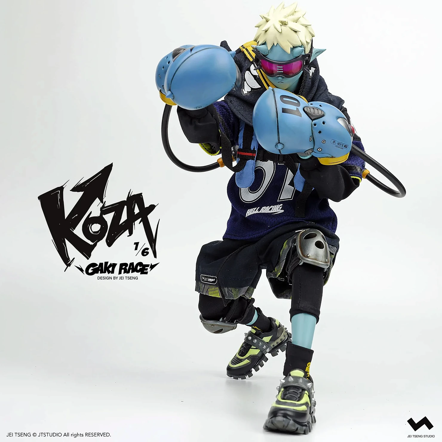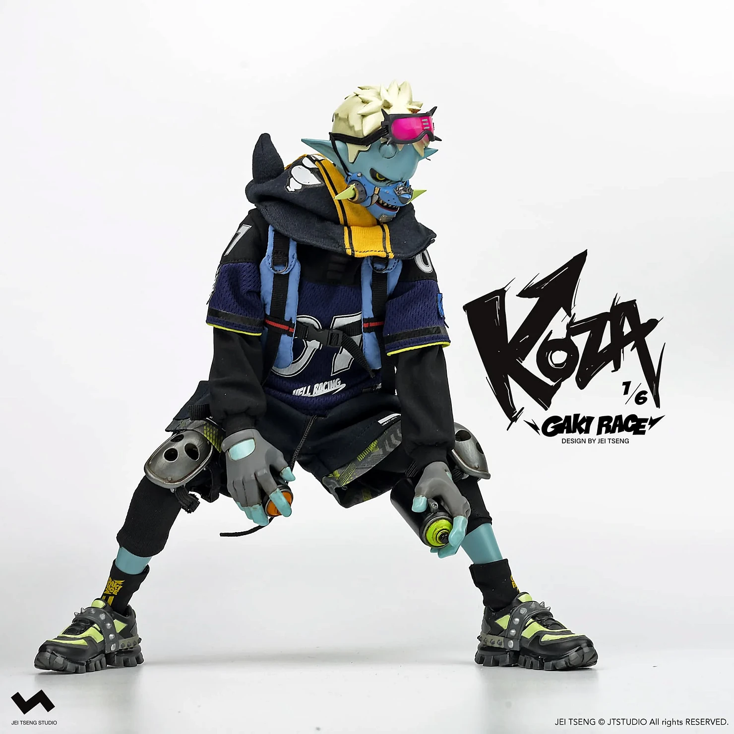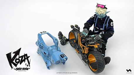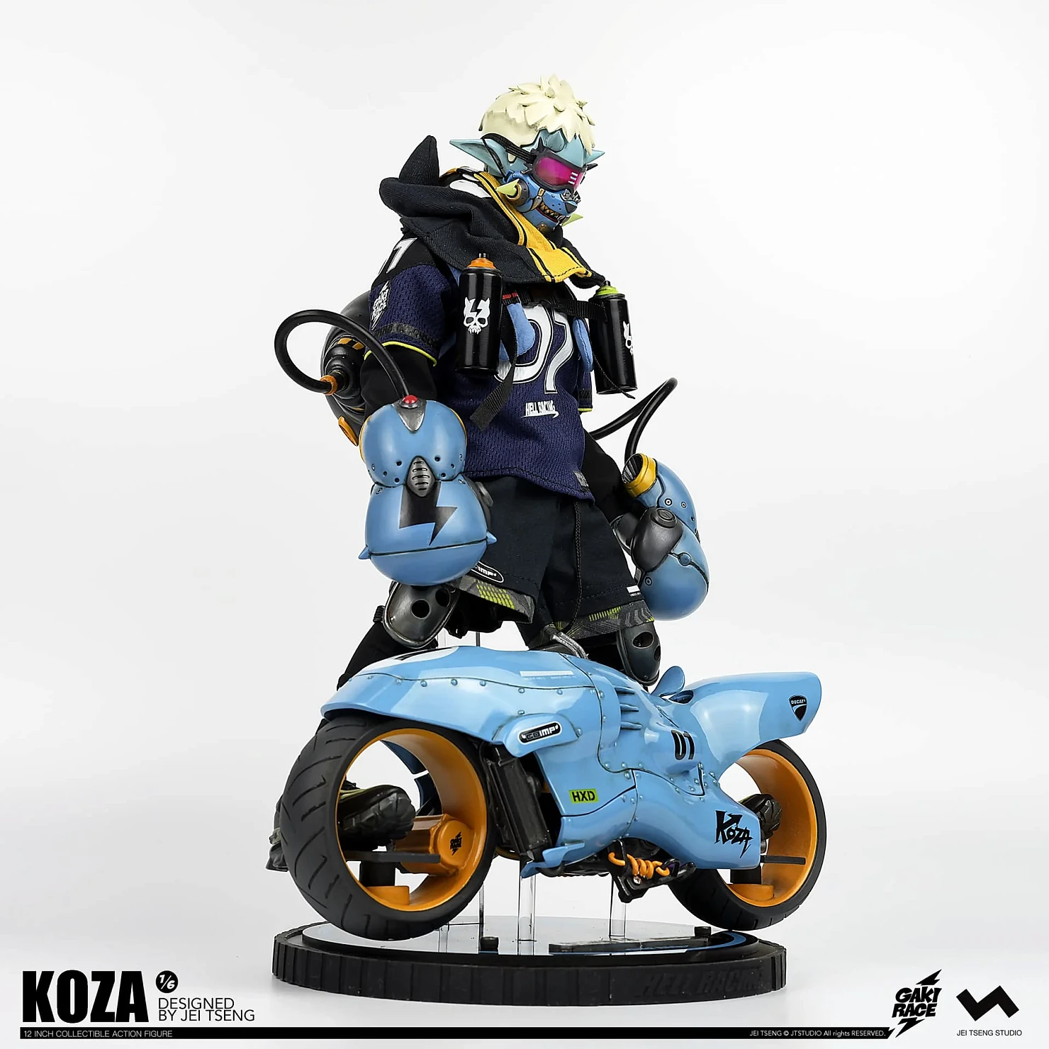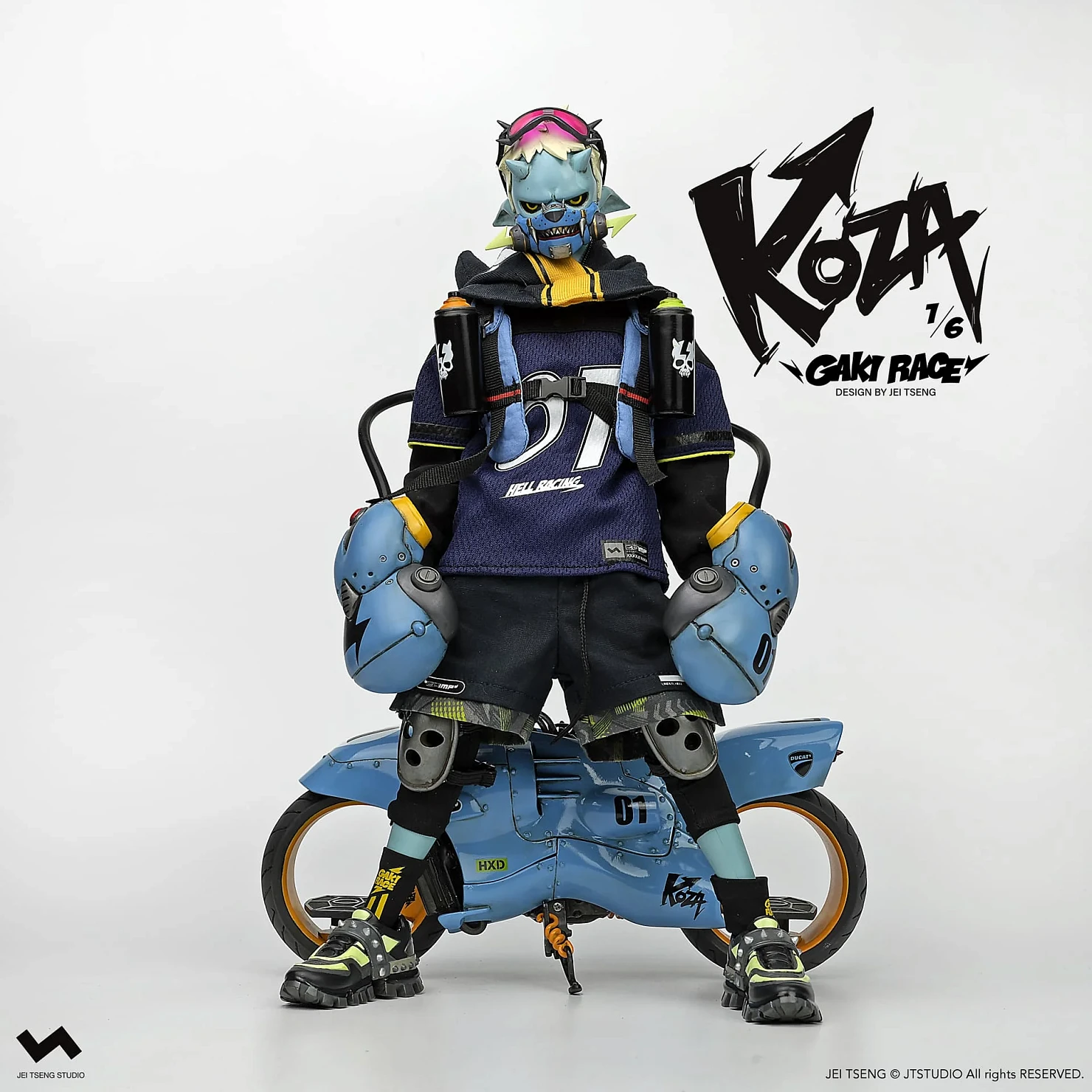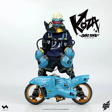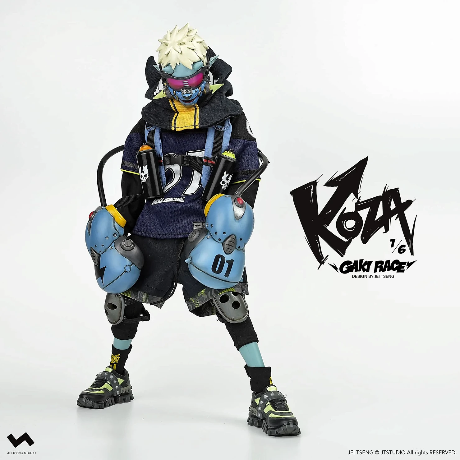 Комплектация: фигурка + защитные очки + реактивный ранец + 2 перчатки + 2 баллончика с краской +2 наколенника + мотоцикл + 4 сменных руки + платформа