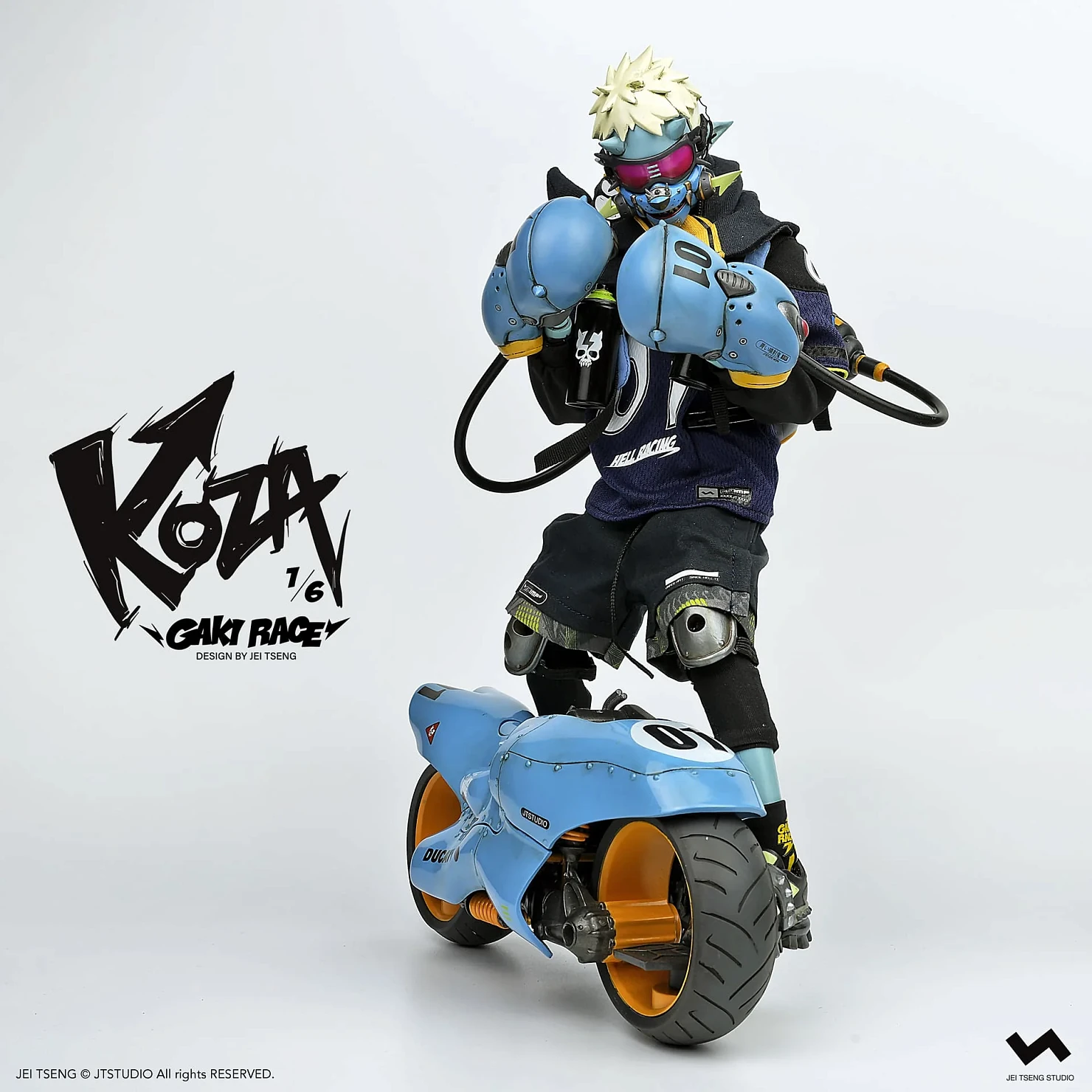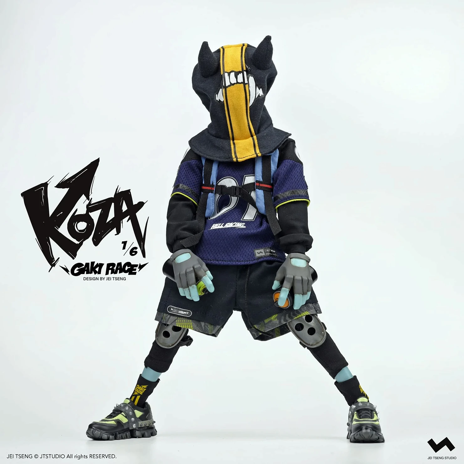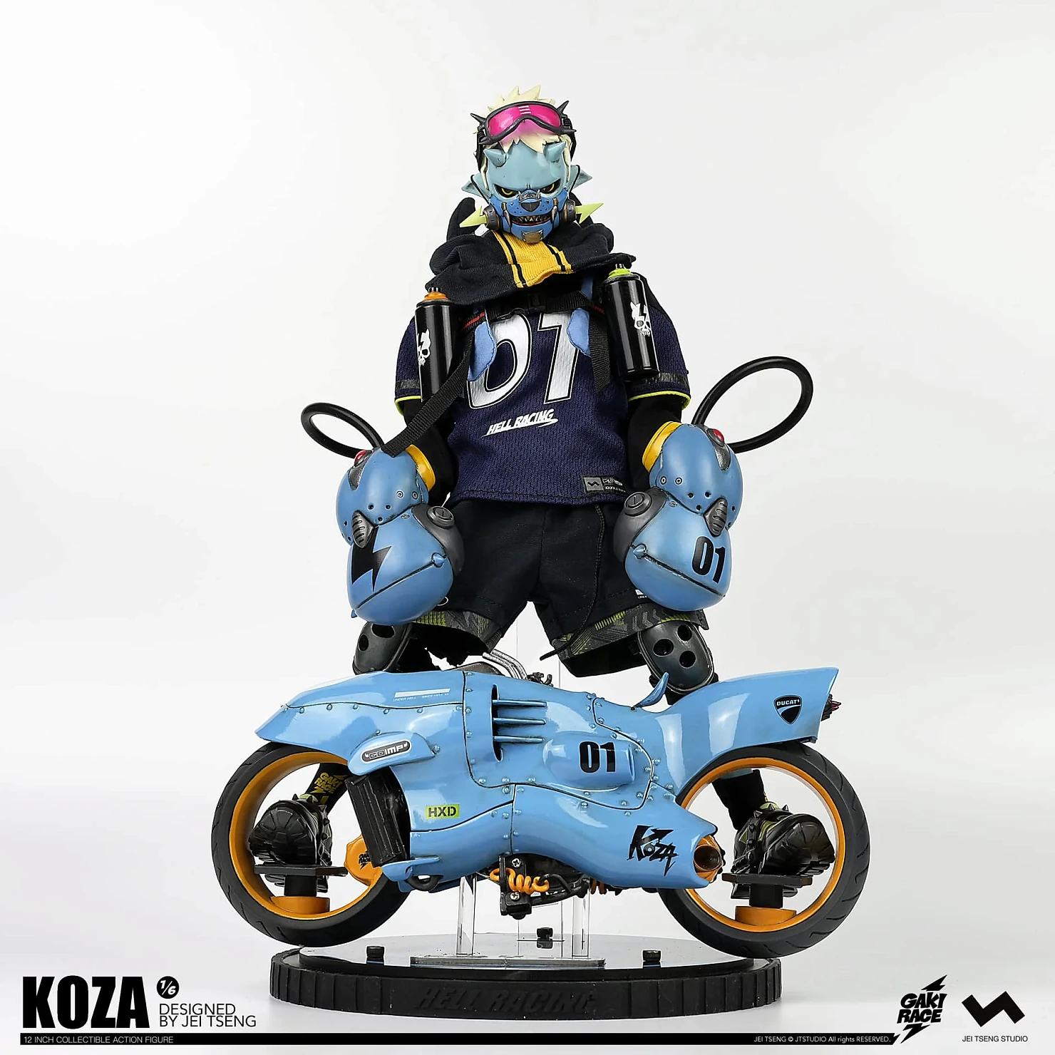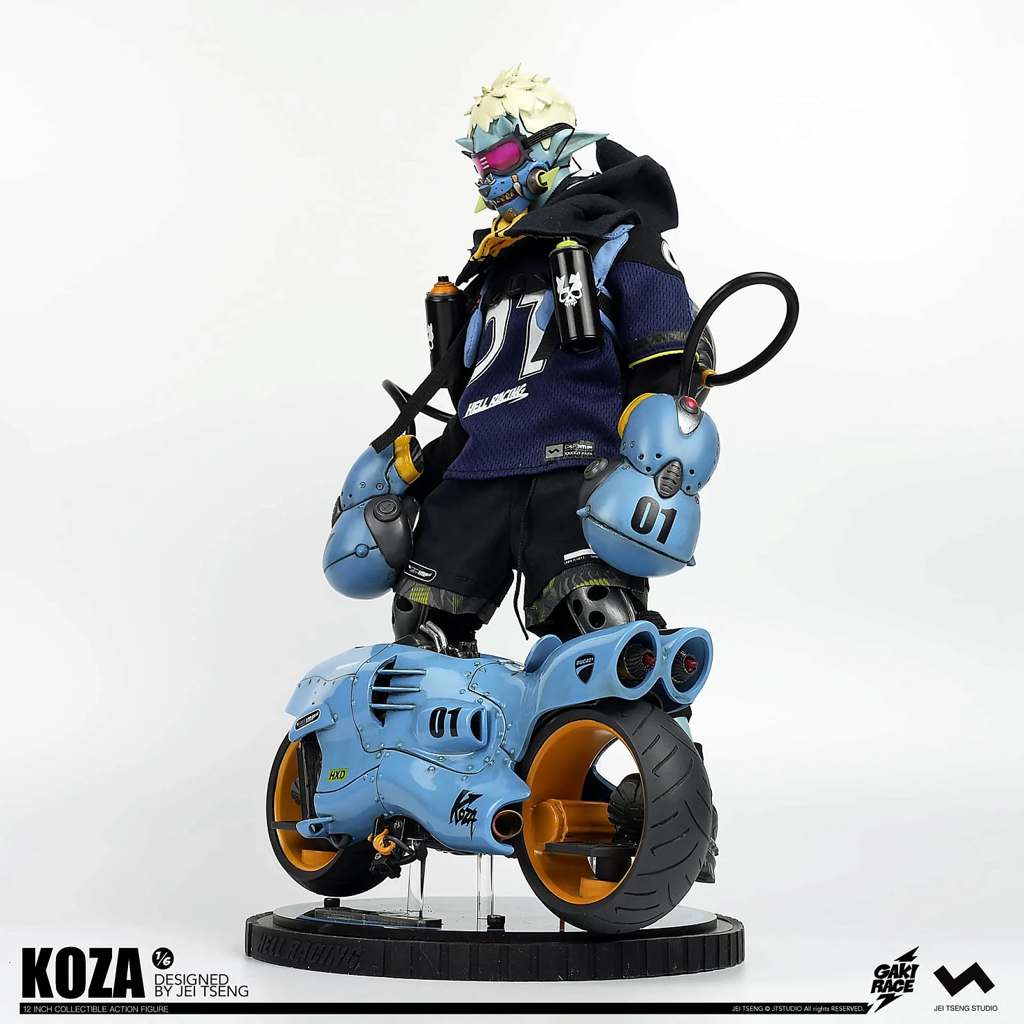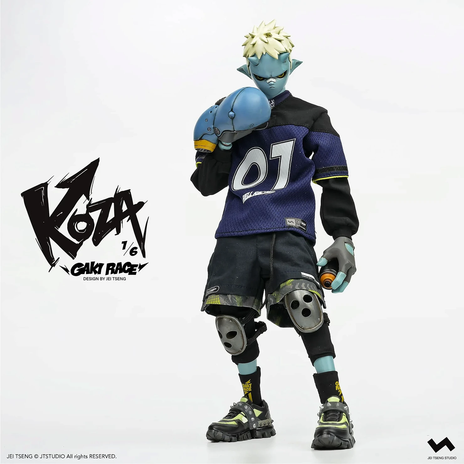 Комплектация: фигурка + защитные очки + реактивный ранец + 2 перчатки + 2 баллончика с краской +2 наколенника + мотоцикл + 4 сменных руки + платформа