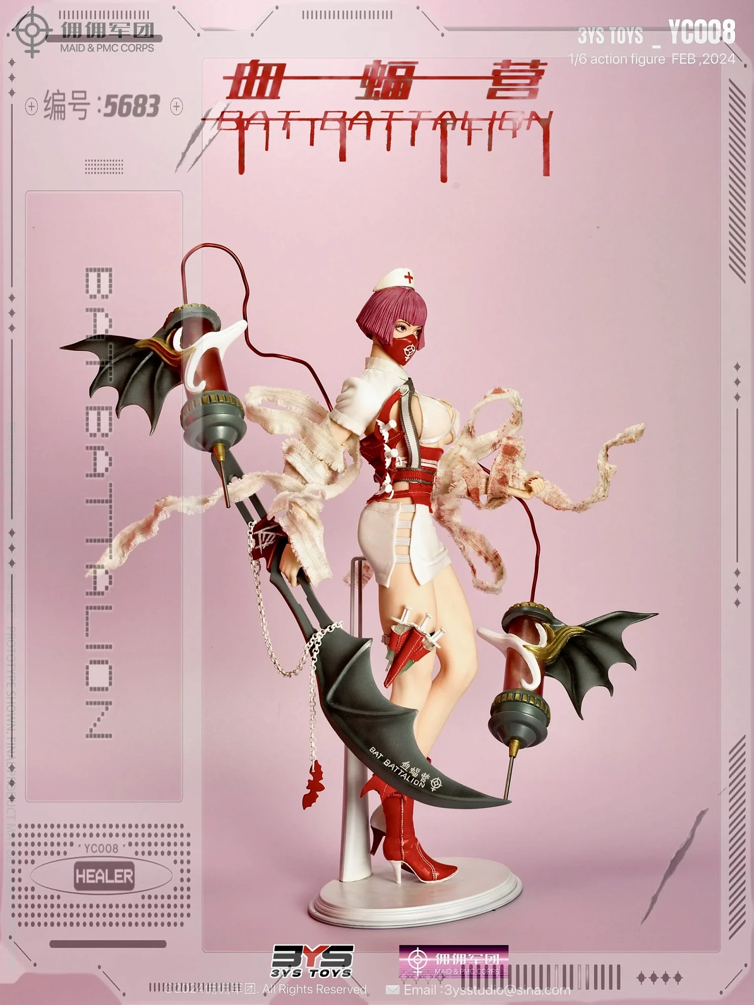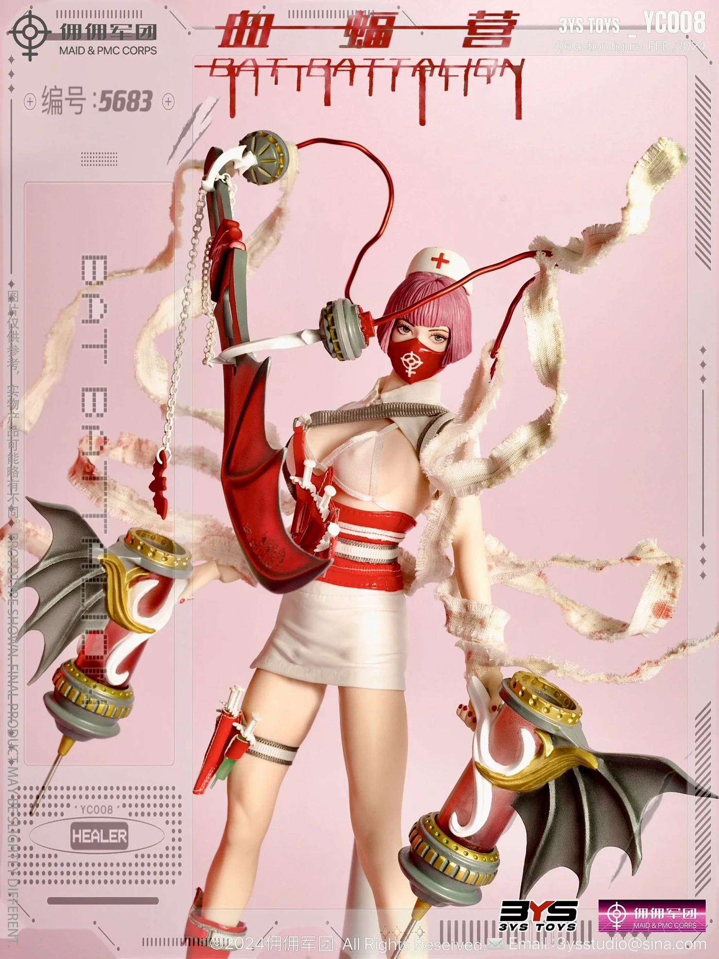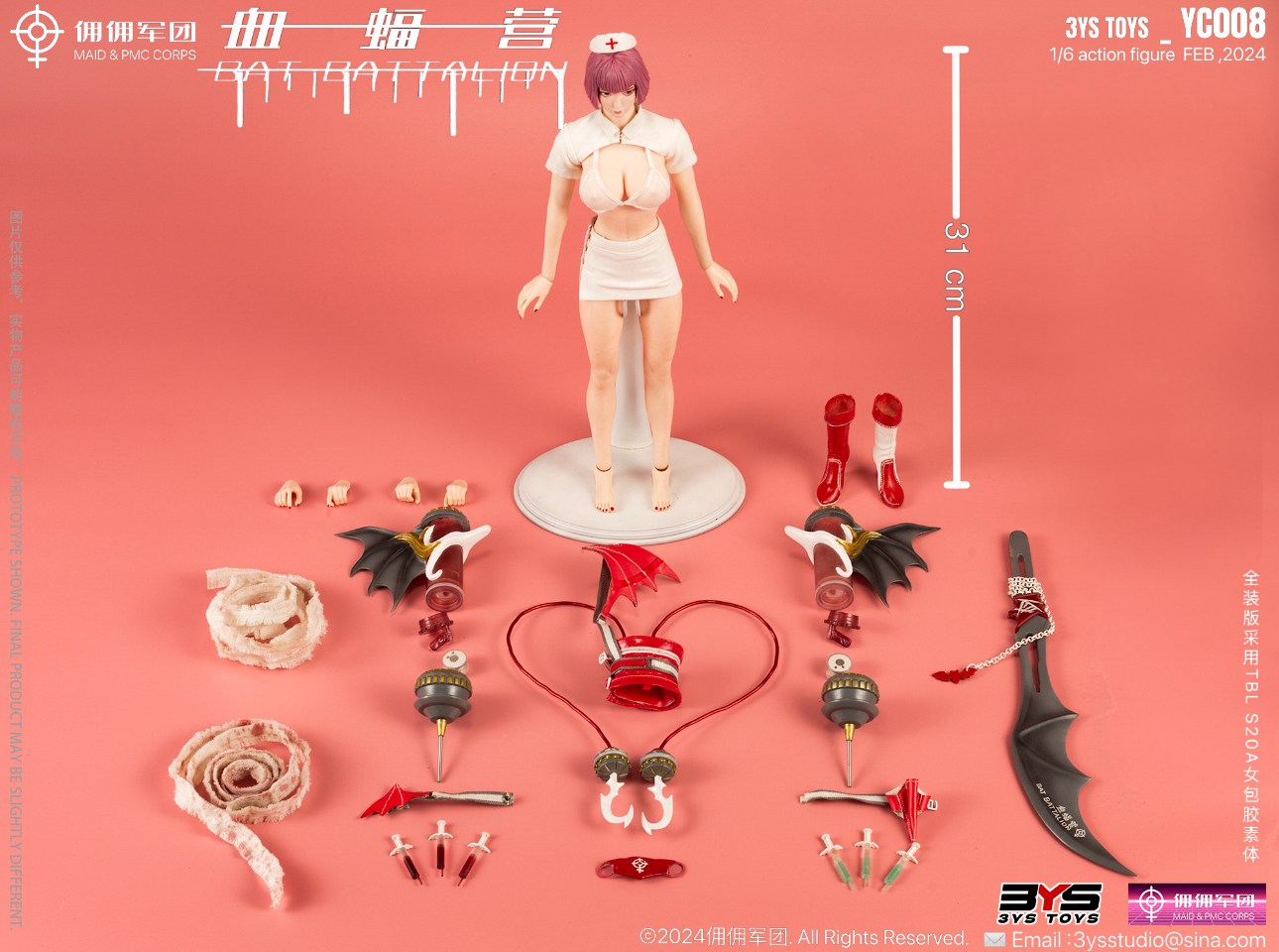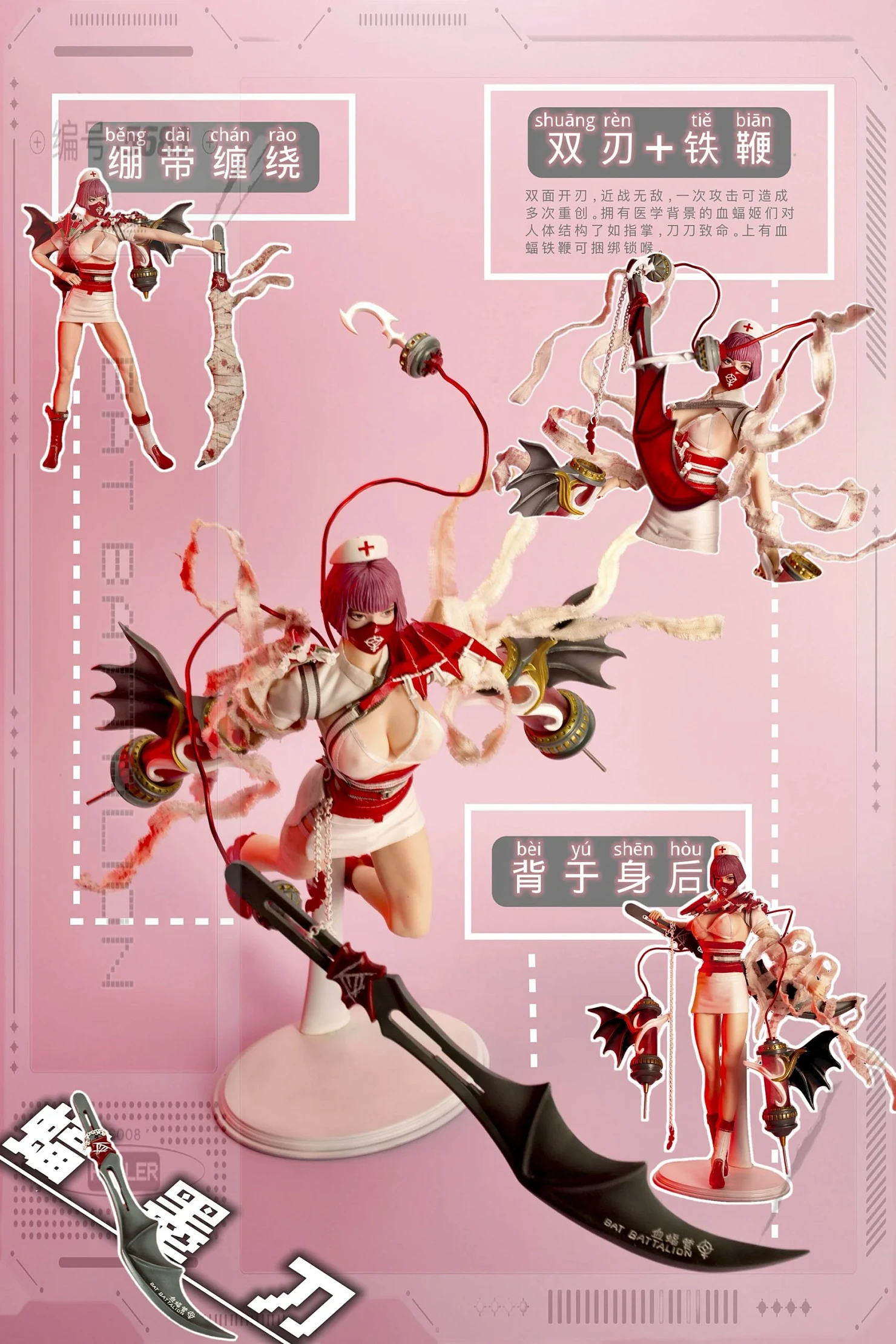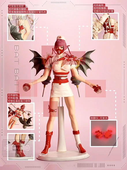 Комплектация: фигурка + шляпка + нижнее белье + куртка + юбка + маска + высокие сапоги 2 шт +гигантская игла в форме крыла летучей мыши*2 (металлическая игла, светящаяся) + дефибриллятор 2 шт + нож с чернилами летучей мыши + кнут кровавой летучей мыши + крючок 2 шт + Боевой пояс (металл) + металлические кровеносные сосуды 2 шт + лечевая накладка двойного назначения в виде крыла летучей мыши*1 + кобура для игольчатого пулемета + украшение на ногу + инструмент для переноски ножа в виде крыла летучей мыши + бинт (содержит железную проволоку) + окровавленная повязка (содержит железную проволоку) + микрокрасная игла 3 шт + микрозеленый шприц 3 шт + световой комплект + сменные руки 6 шт + кронштейн
