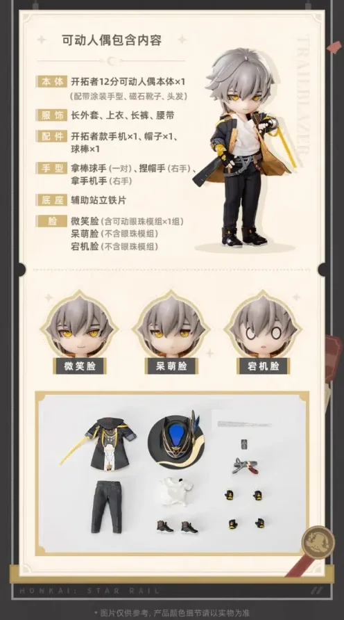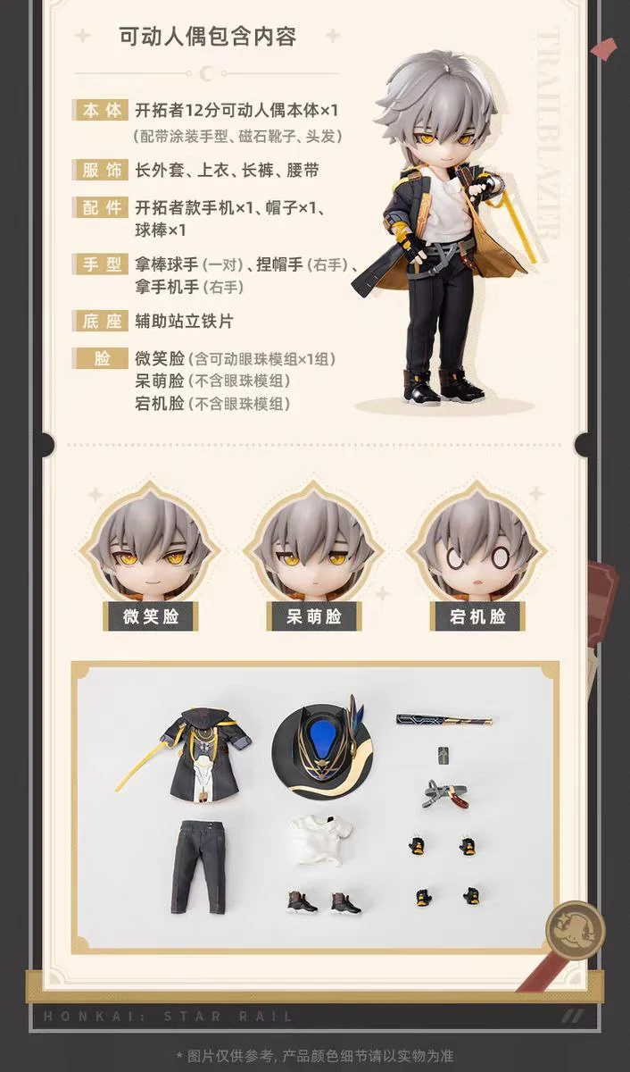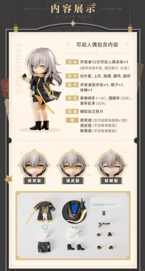 Комплектация: фигурка + три сменных выражения лица + пальто + брюки + ремень + шляпа + нижнее белье + обувь + мобильный телефон + бейсбольная бита + пара рук держащие биту + правая рука держащая шляпу + правая рука держащая мобильный телефон + база + бонусный предмет (значок с кошачьими ушами)