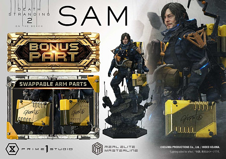 Комплектация: персонаж + снаряжение + сменная голова (с капюшоном) + сменные части рук + пистолет + штурмовая винтовка + 2 сменных рюкзака (с грузом, без груза) + платформа + карго с автографом Хидэо Кодзимы