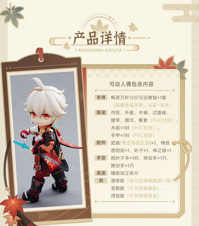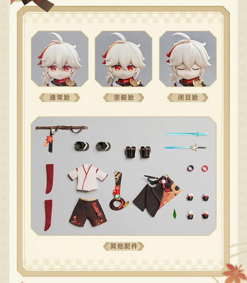 Комплектация: фигурка + 3 лица (обычное лицо (с подвижными глазами), решительное лицо, лицо с закрытыми глазами) + рубашка + накидка + штаны + ремень + гольфы + шарф + пара сабо + пара наголенников + два меча + листочек + 4 кисти рук