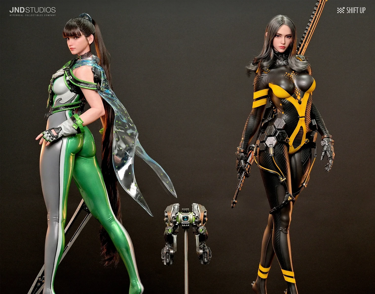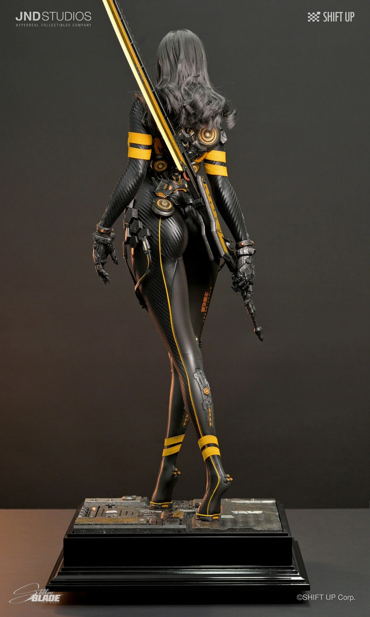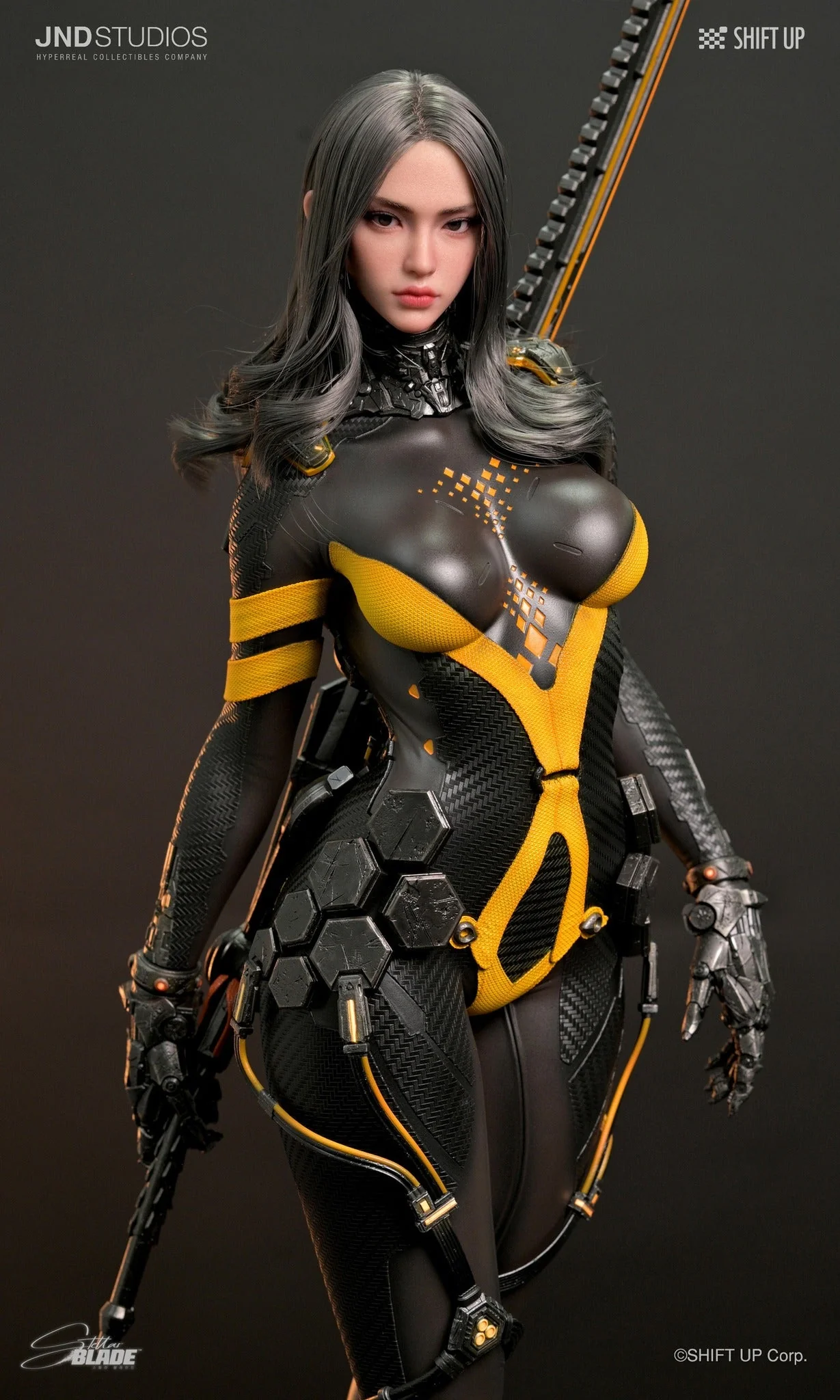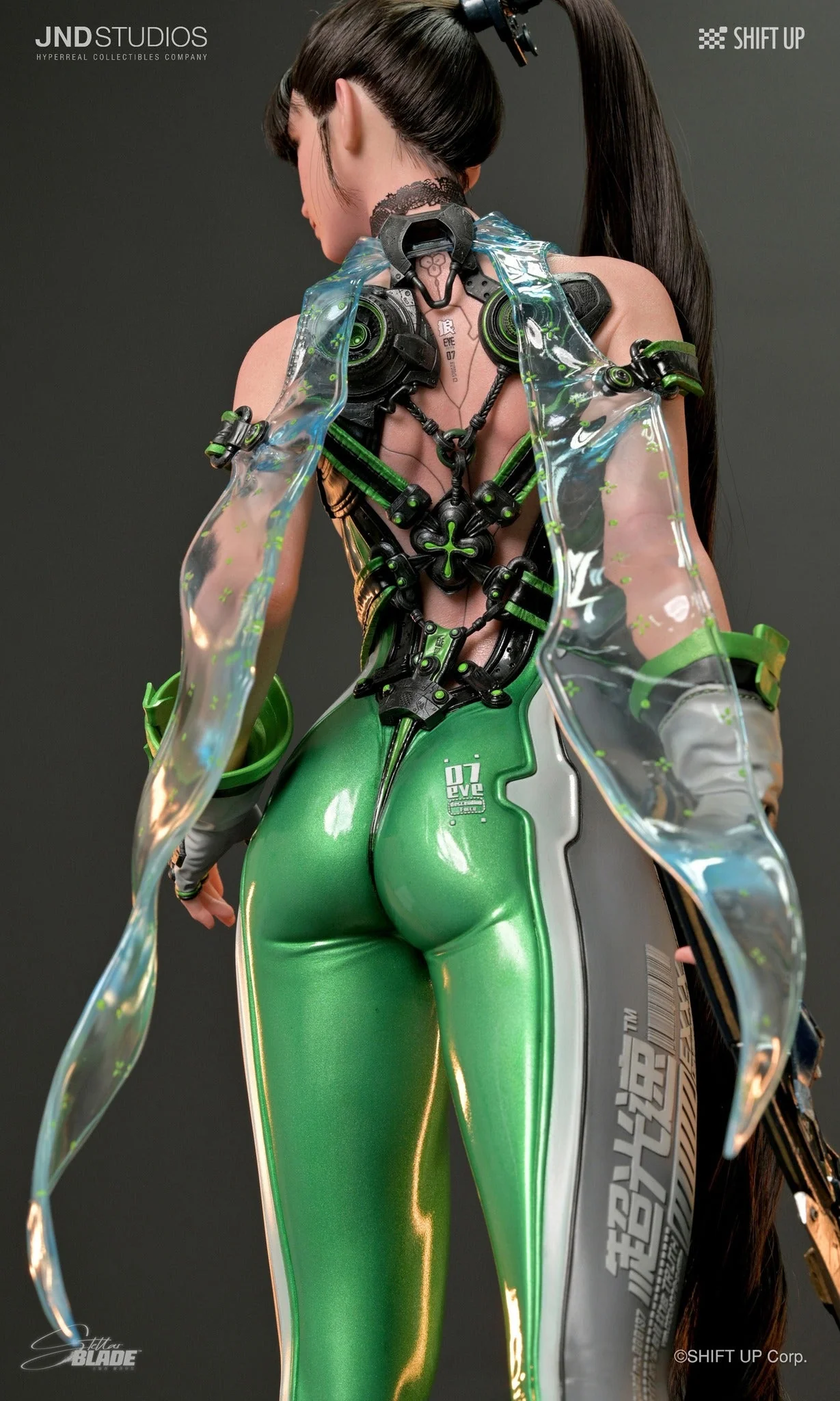 Комплектация Евы: голова (силикон, прошитые волосы, стеклянные глаза, ресницы) + тело (обе руки и спина из силикона, костюм и перчатки из смолы) + чокер на шею (ткань) + резинка для волос (смола) + меч (смола) + основание (смола)