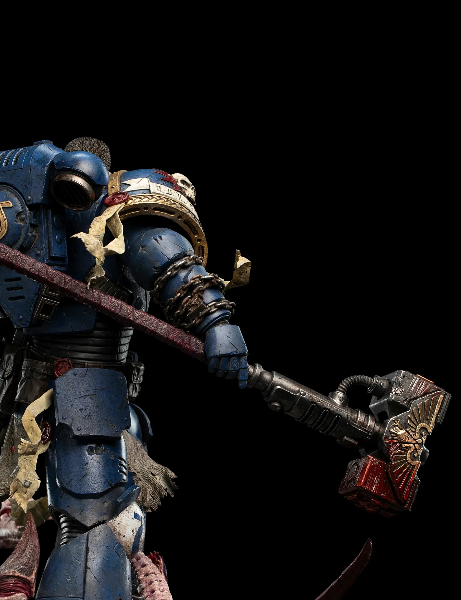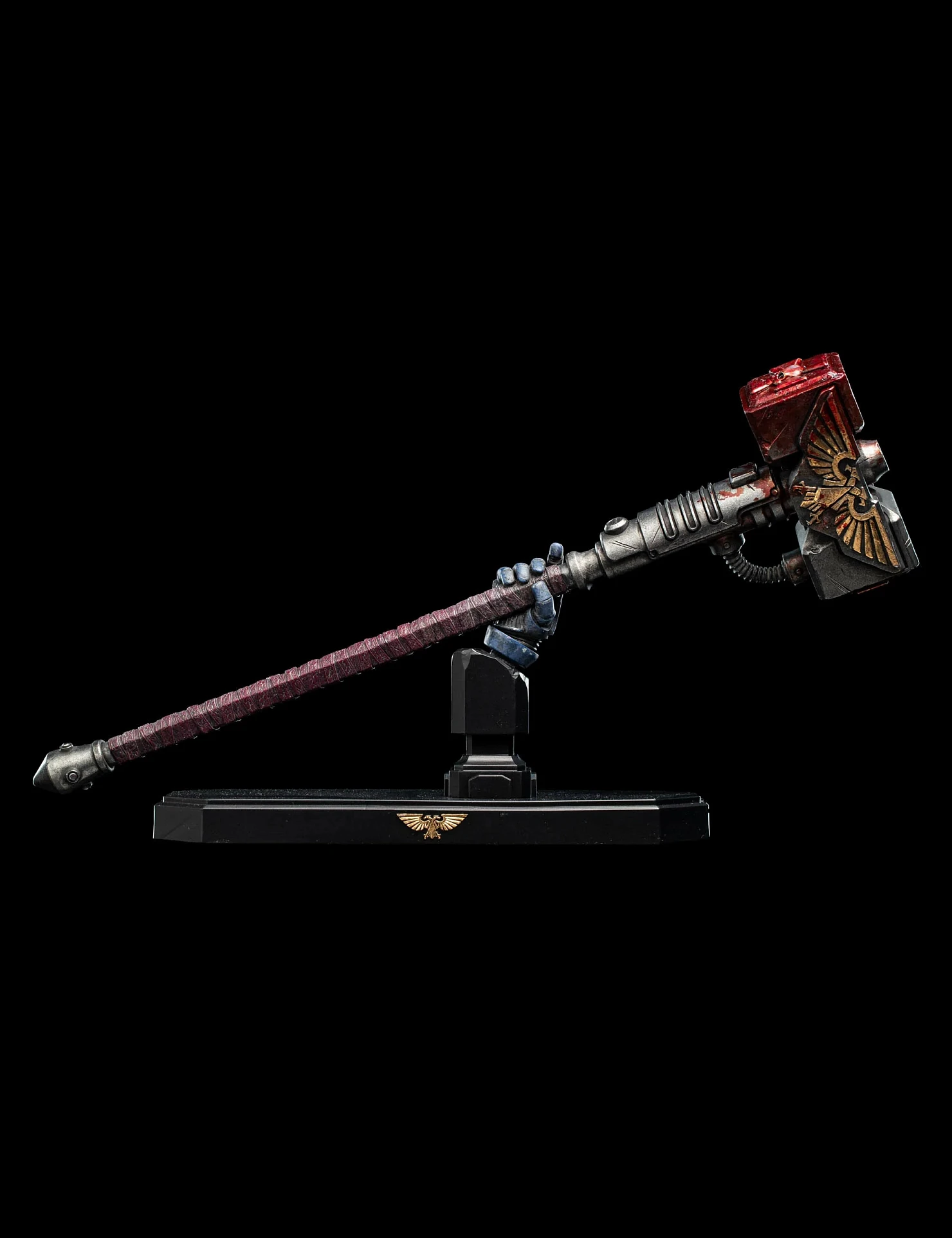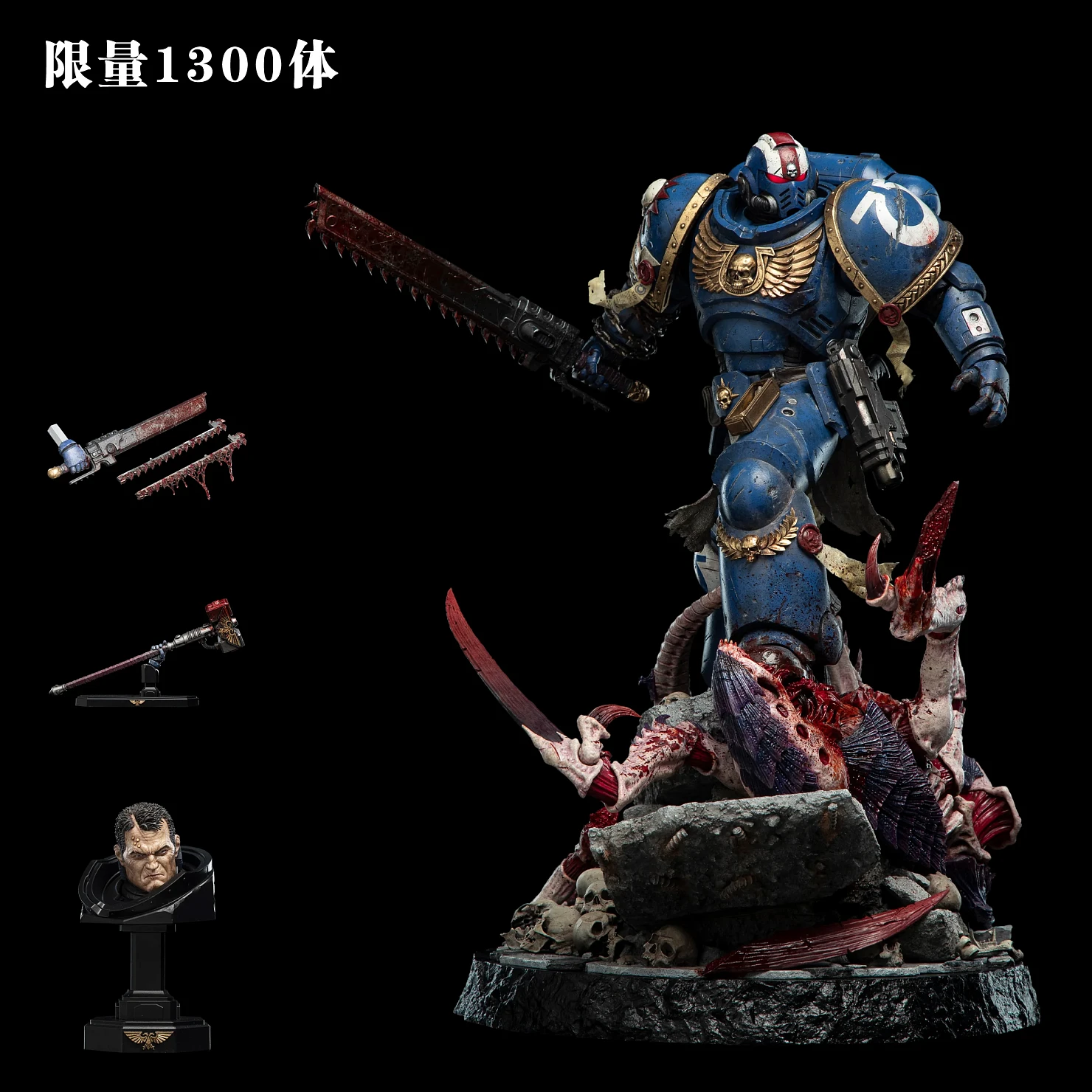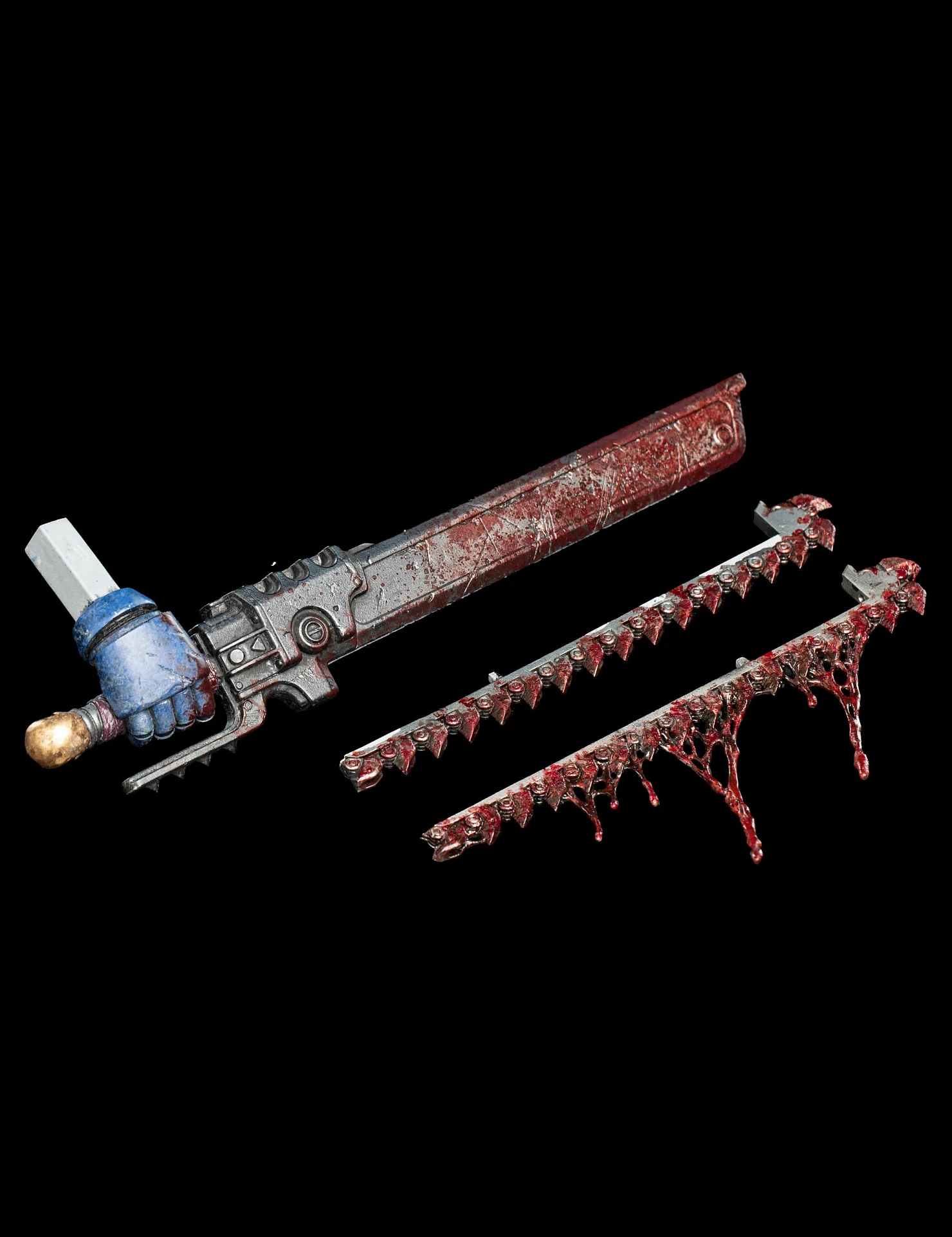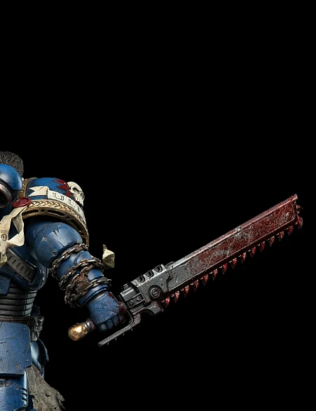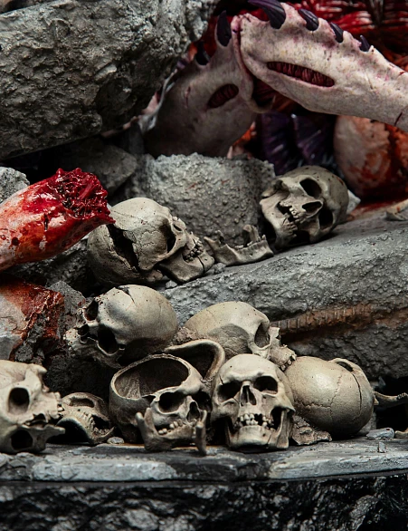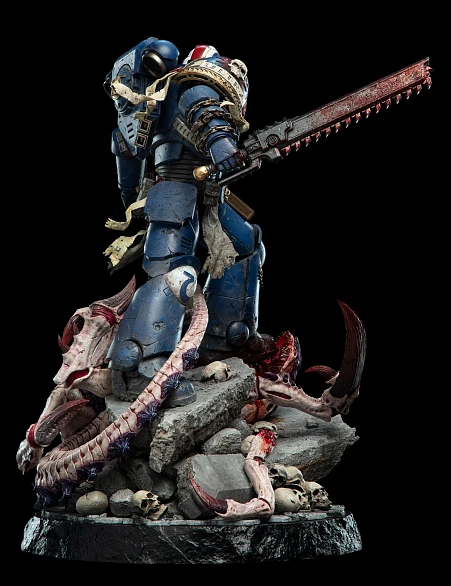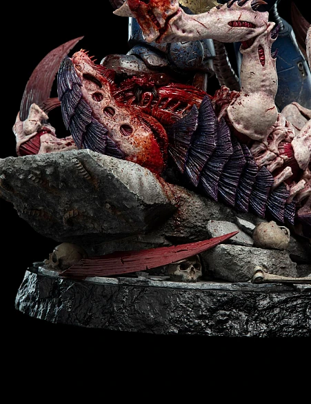 Комплектация: статуя + цепной меч + сменное лезвие с кровью + молот + светодиодный съемный шлем (требуется батарея 23А, в комплект не входит) + подставка для шлема + подставка для оружия + платформа