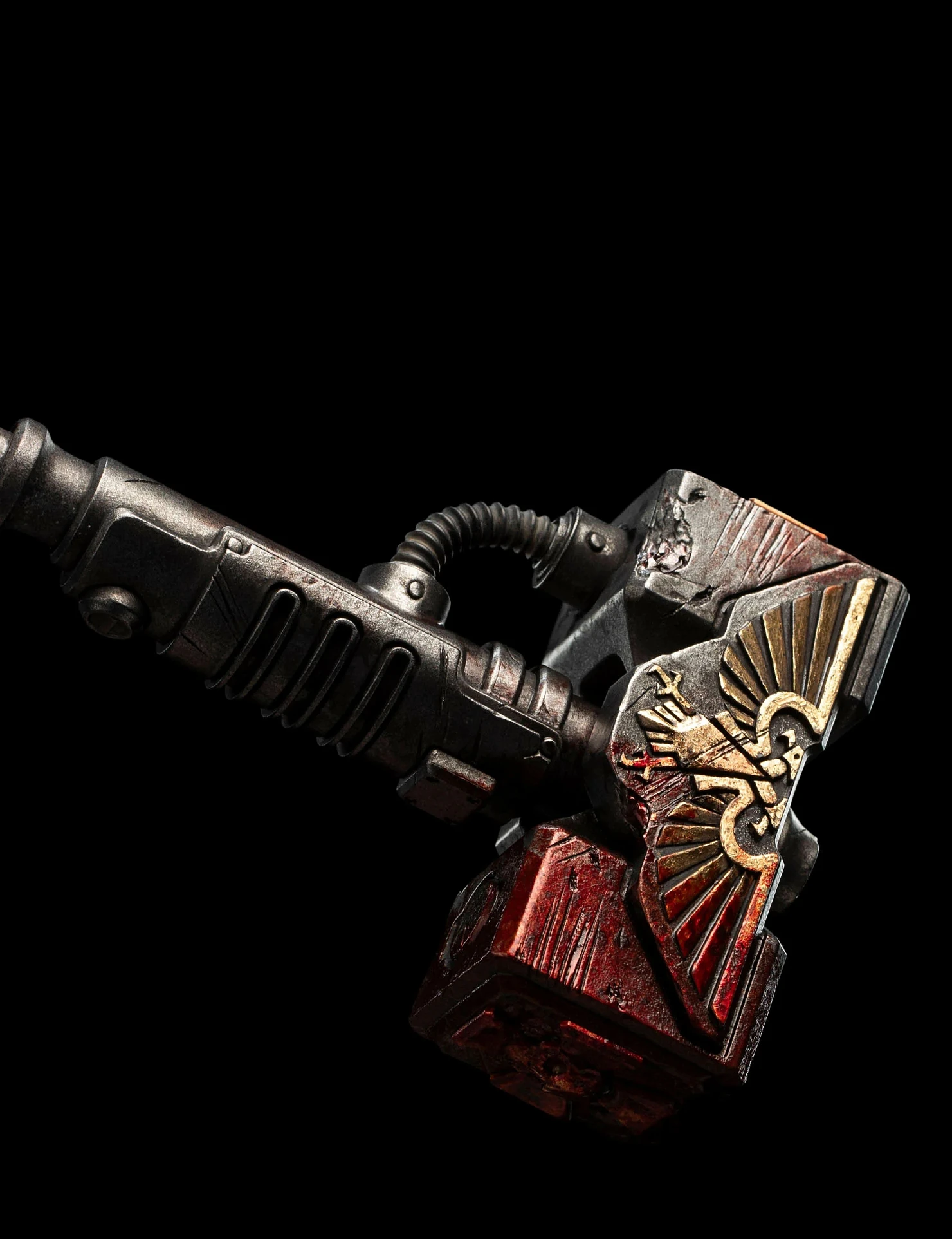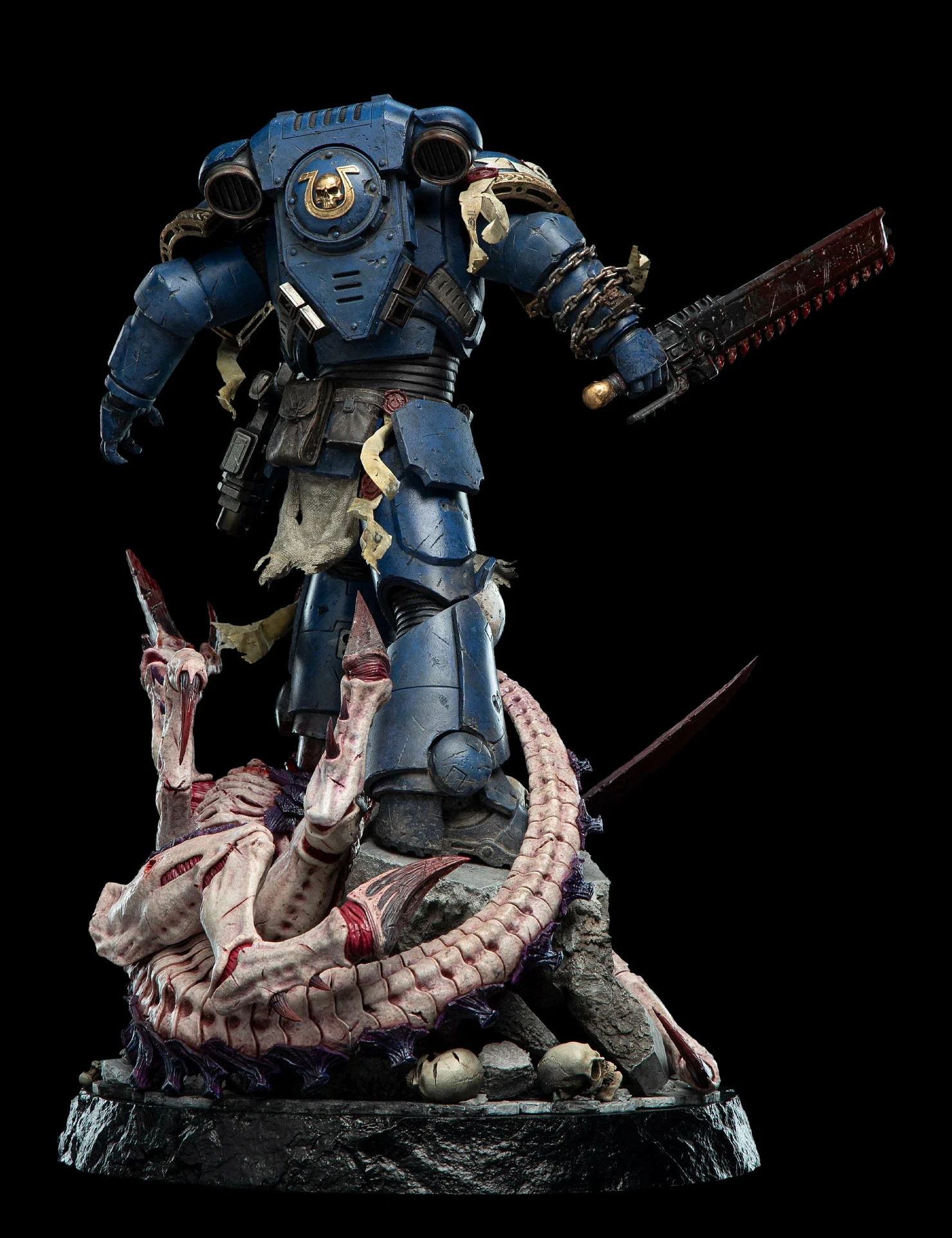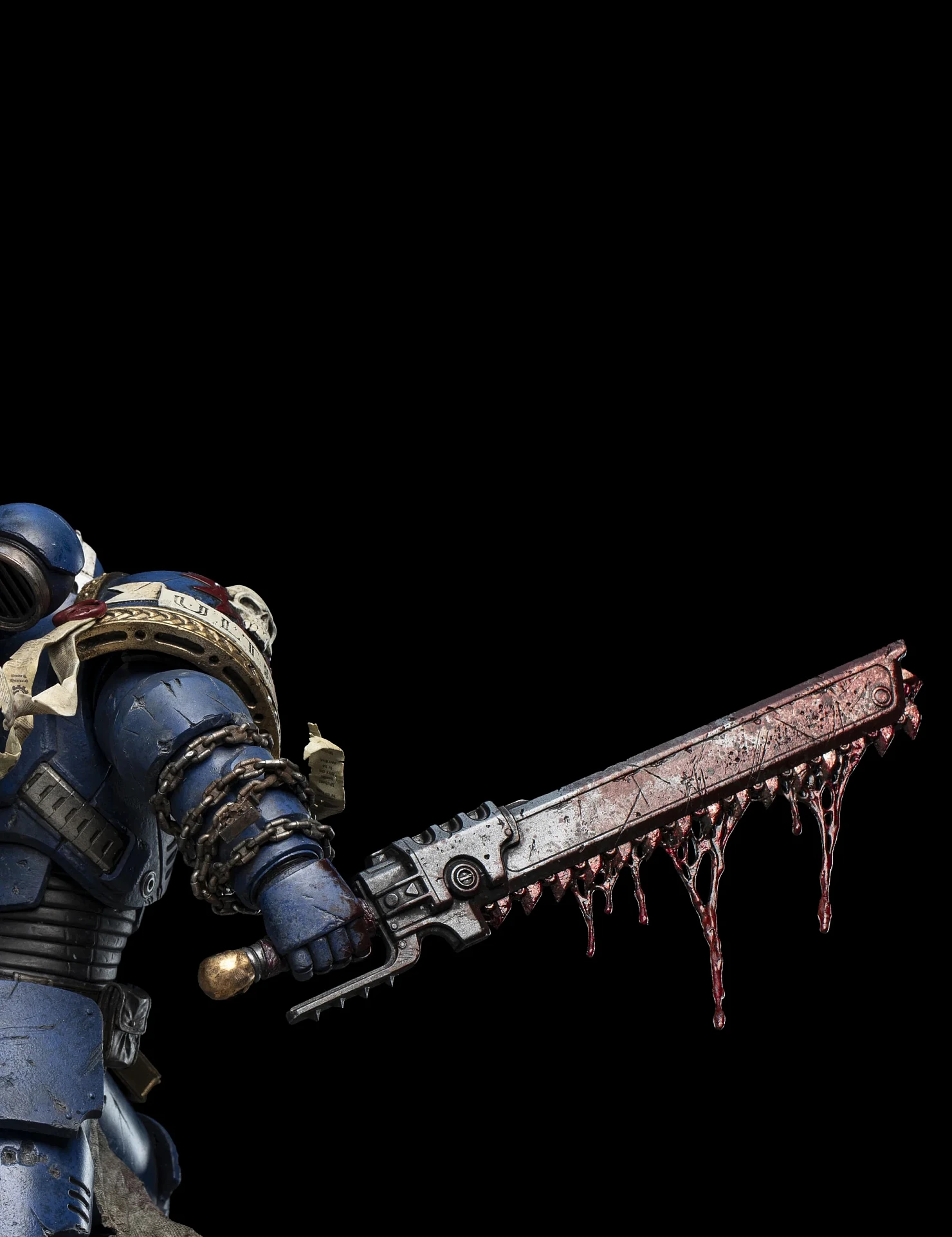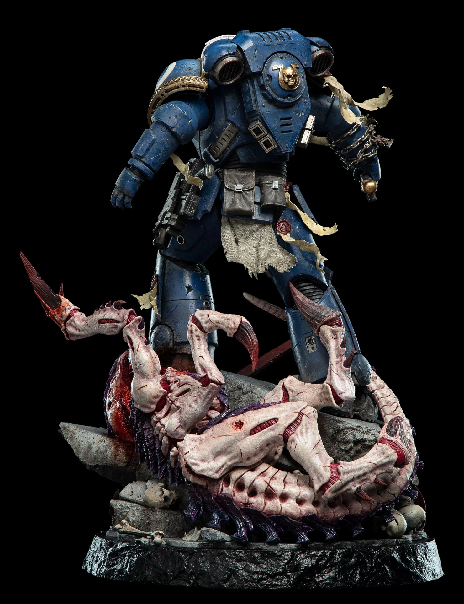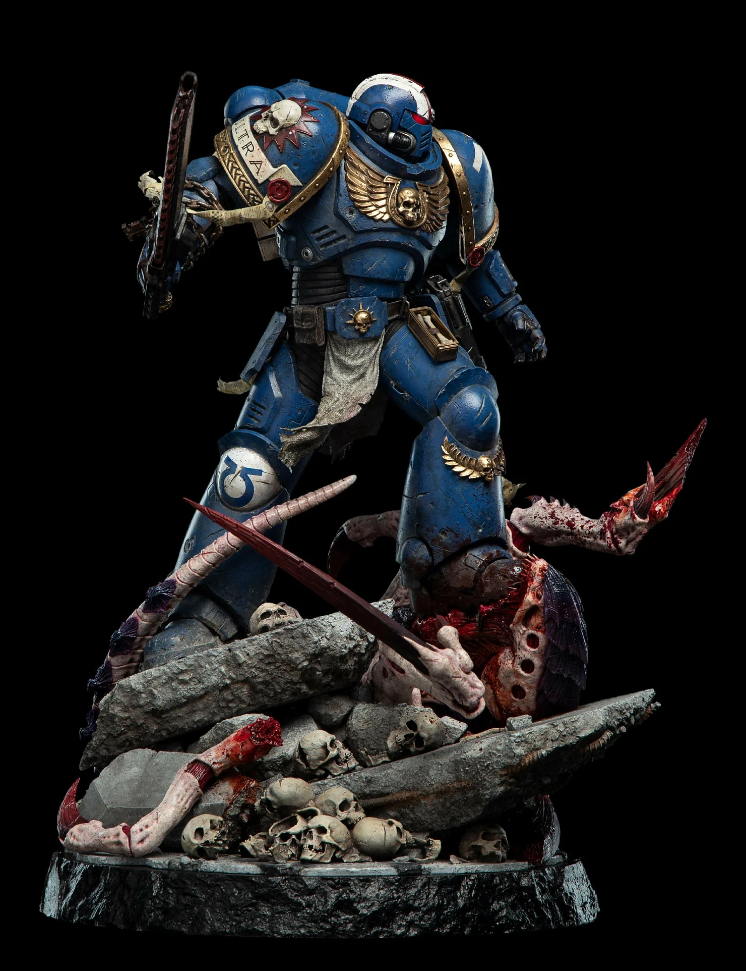 Комплектация: статуя + цепной меч + сменное лезвие с кровью + молот + светодиодный съемный шлем (требуется батарея 23А, в комплект не входит) + подставка для шлема + подставка для оружия + платформа