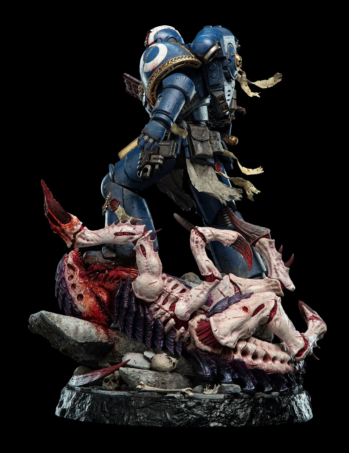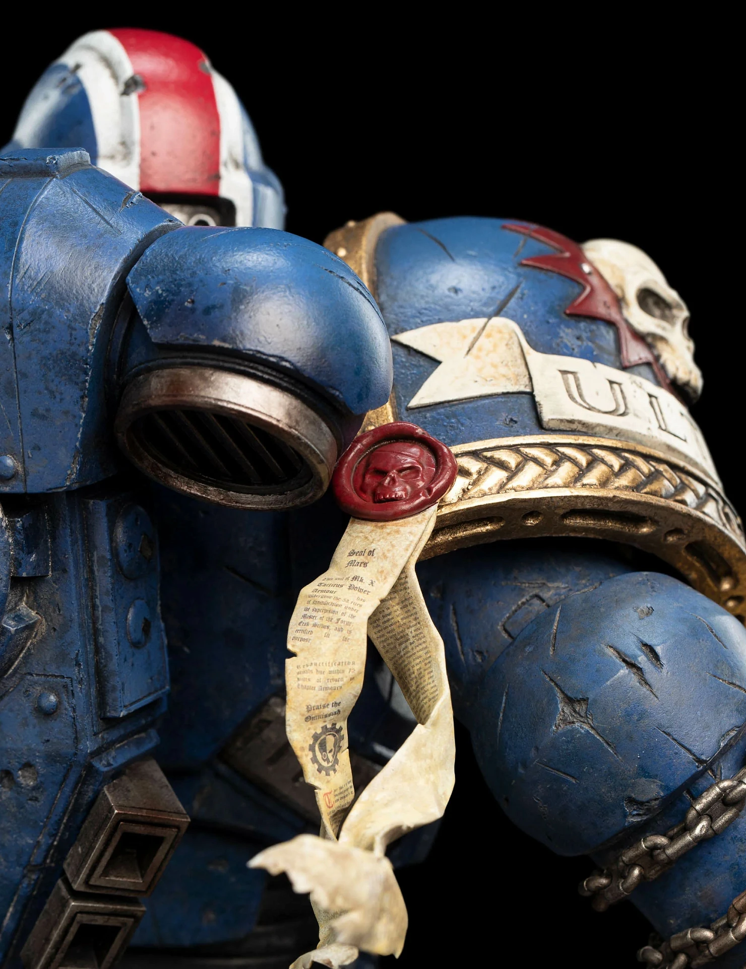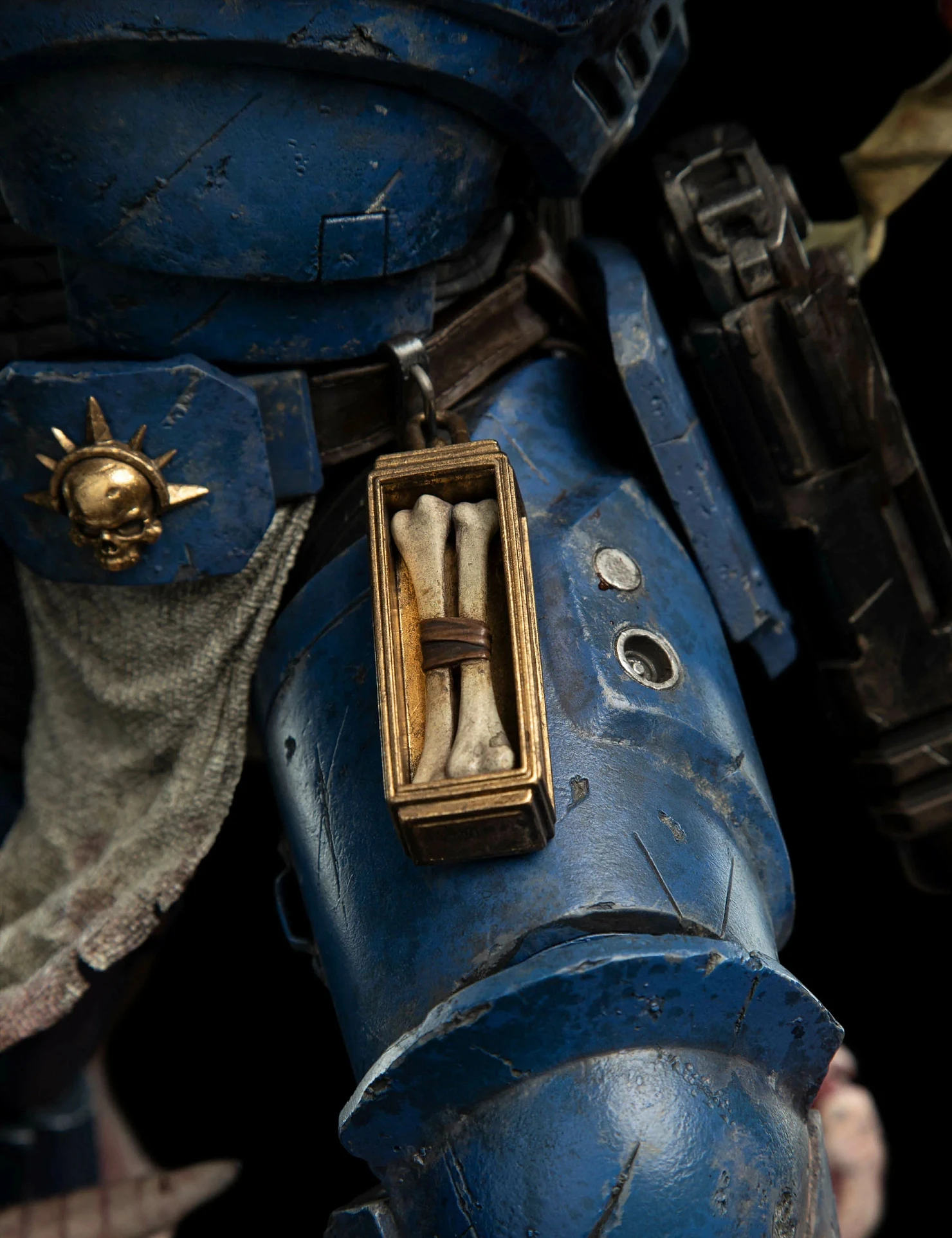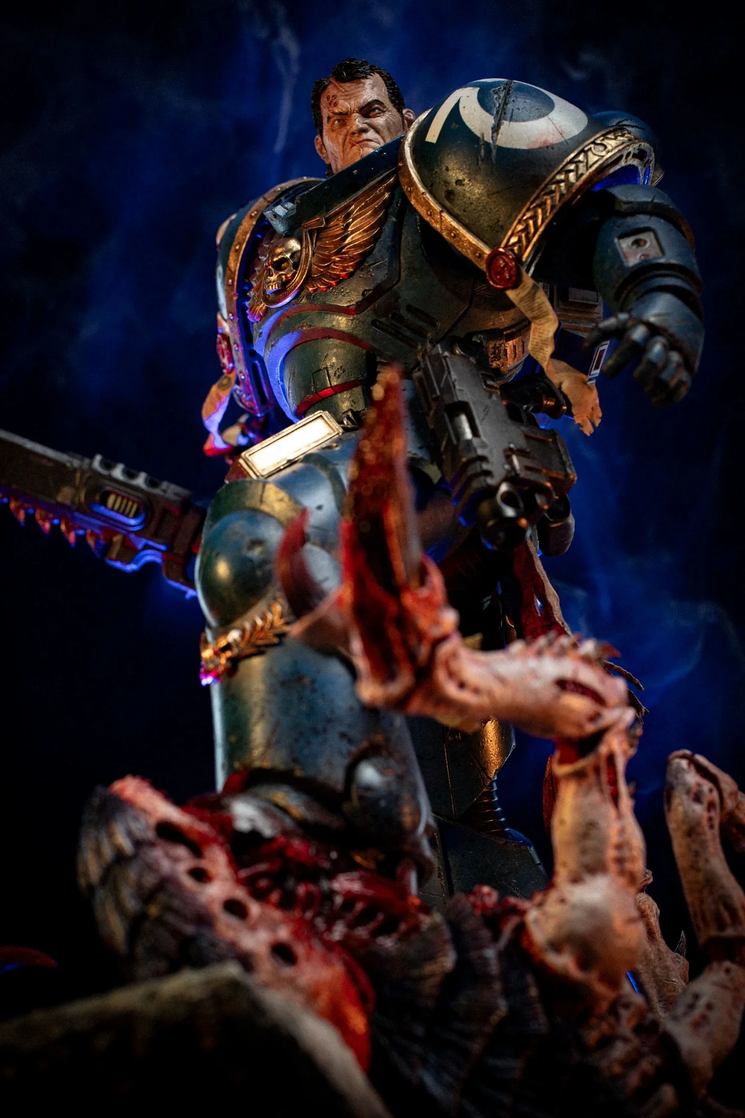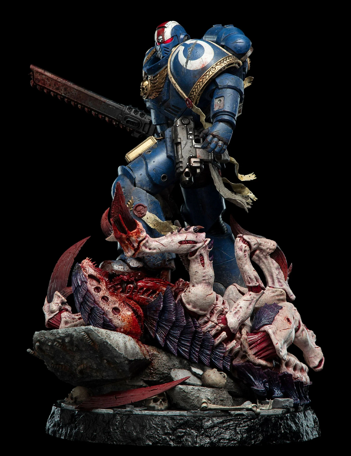 Комплектация: статуя + цепной меч + сменное лезвие с кровью + молот + светодиодный съемный шлем (требуется батарея 23А, в комплект не входит) + подставка для шлема + подставка для оружия + платформа