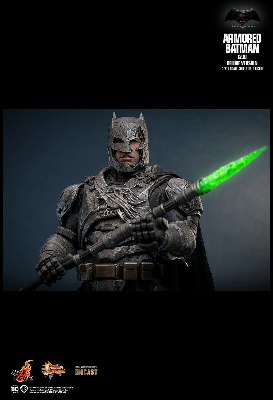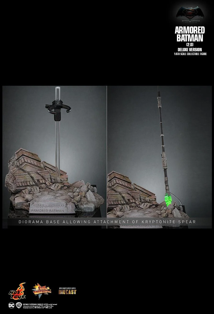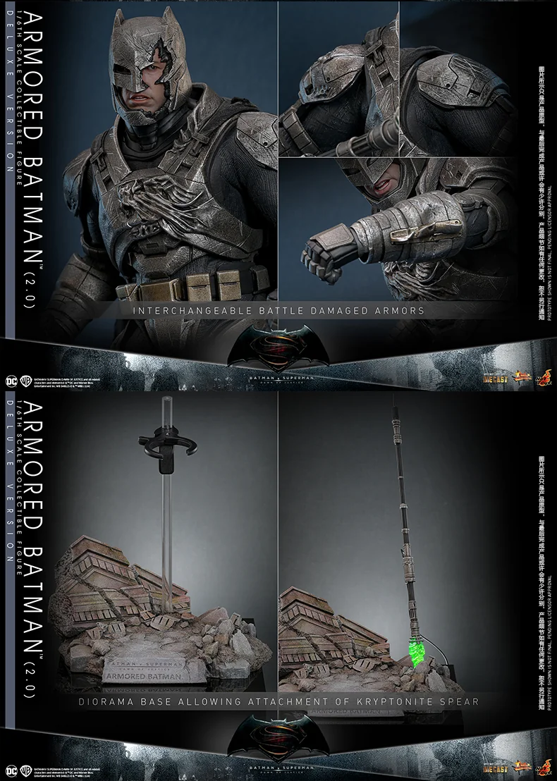 Комплектация: обычная версия + сменная голова + поврежденная броня + криптонитовое копье со светодиодной подсветкой + платформа-диорама